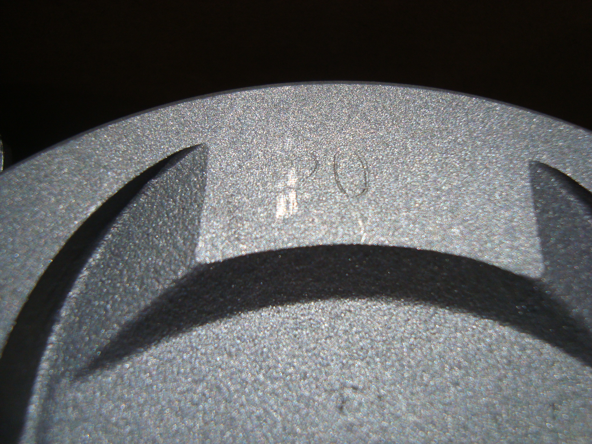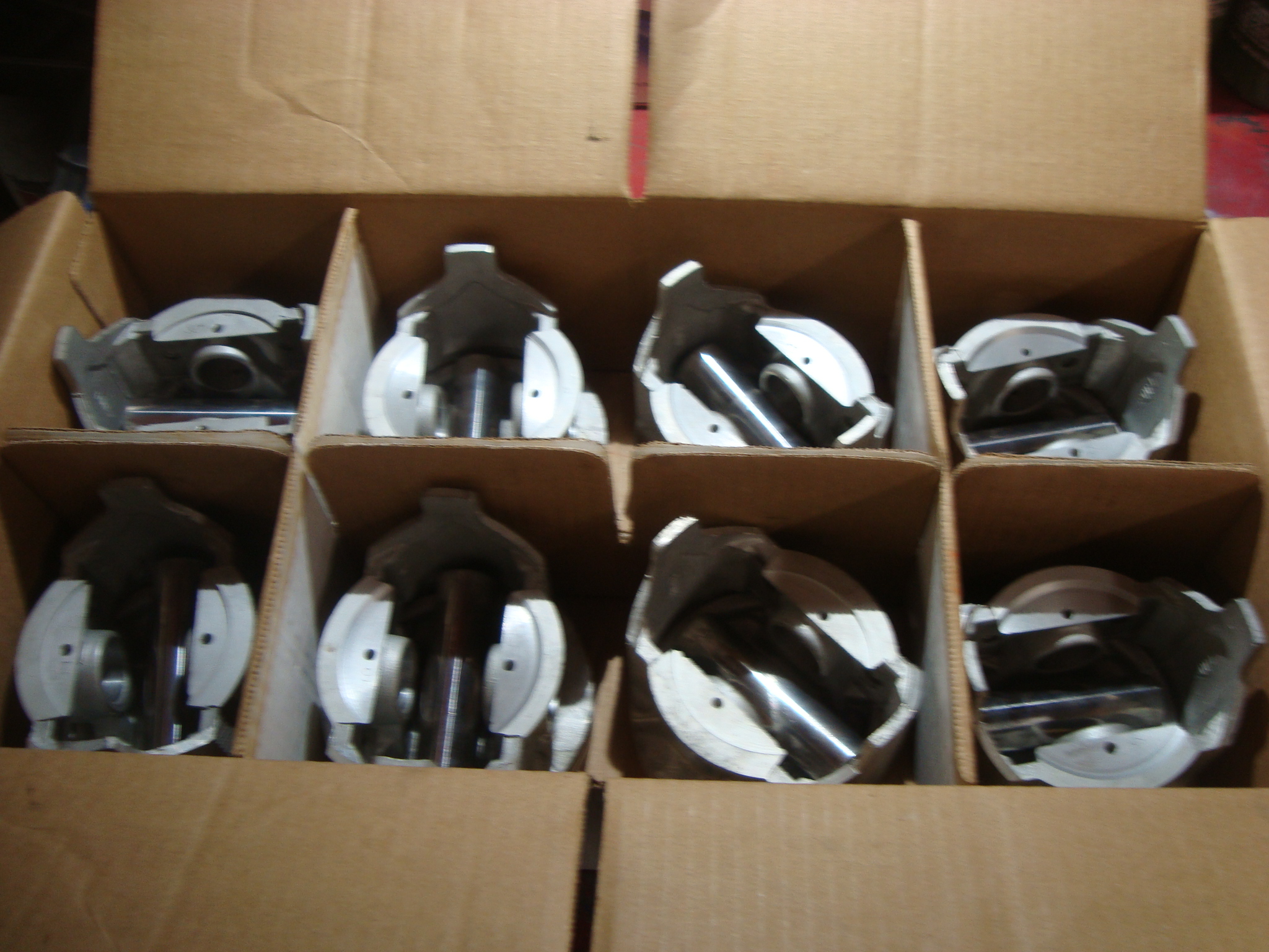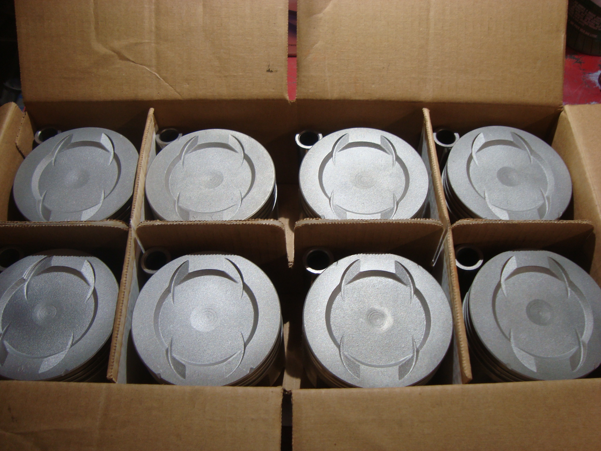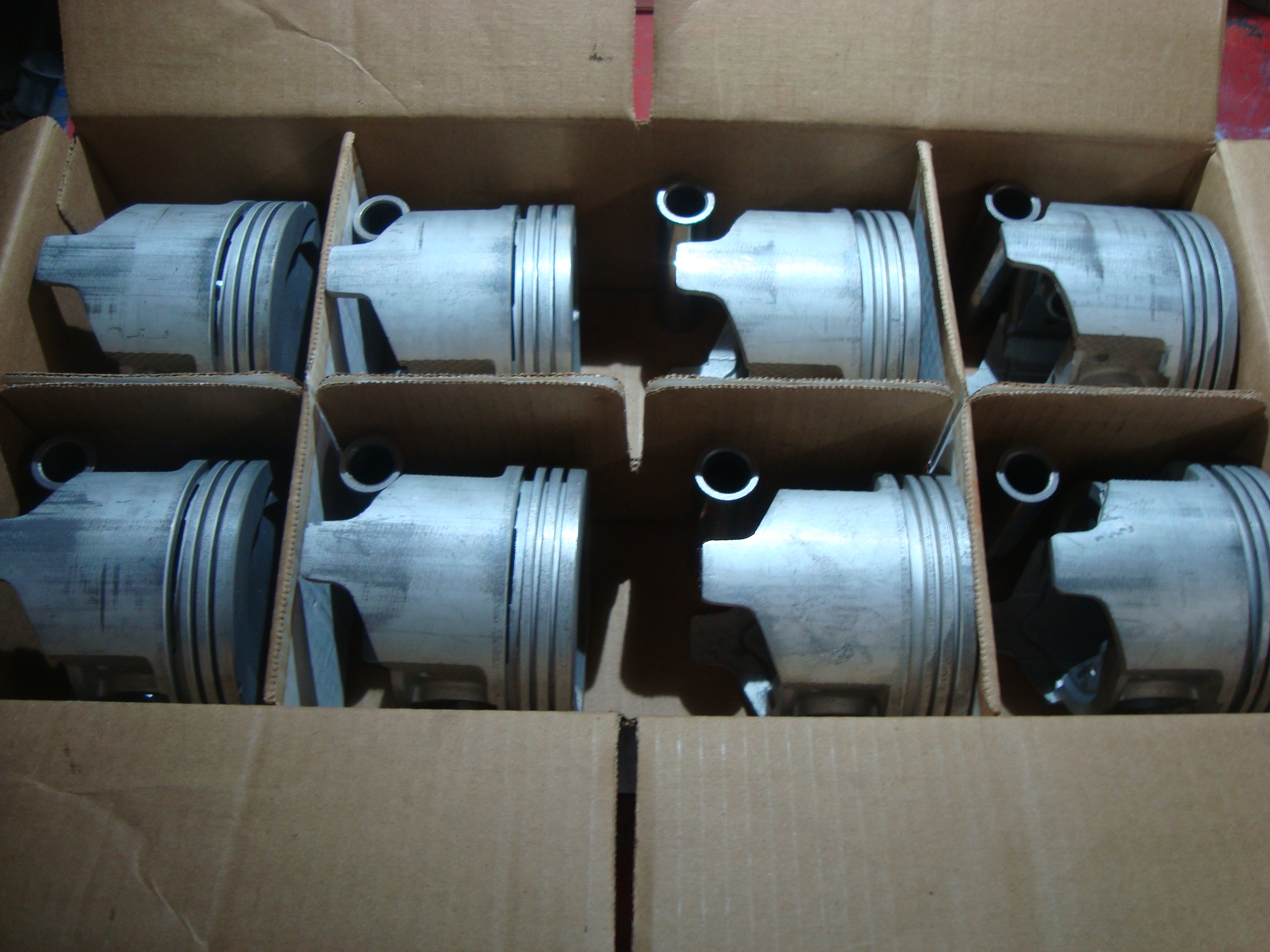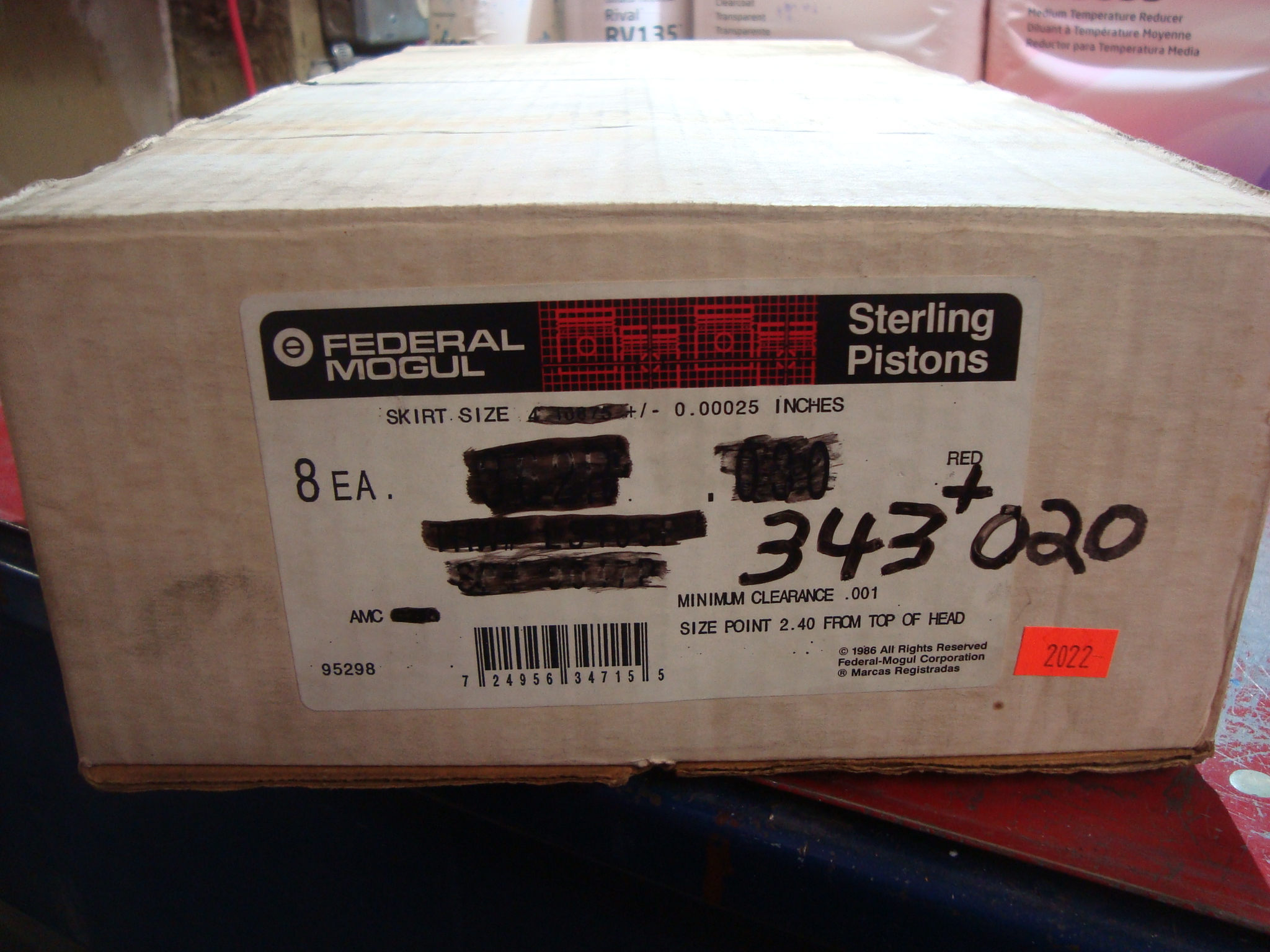AMC AMX Javelin & others .020 over 343 Federal Mogul Sterling pistons, NOS. Looks to me that they had been used for mock up. Two look like they might have been slid in a bore. They had been numbered 1 through 8. And the tops look like they have been media blasted. And they have the shelf wear from just being moved a round for years. No harm, the fit was probably to loose and had to go to .030s.