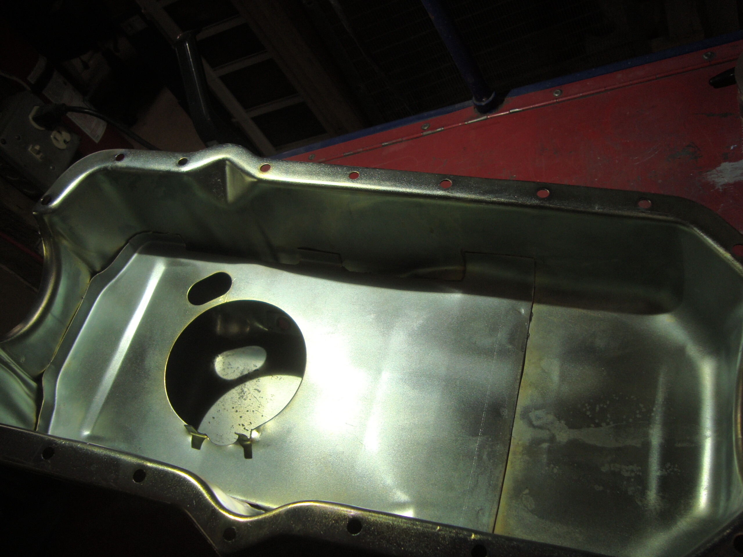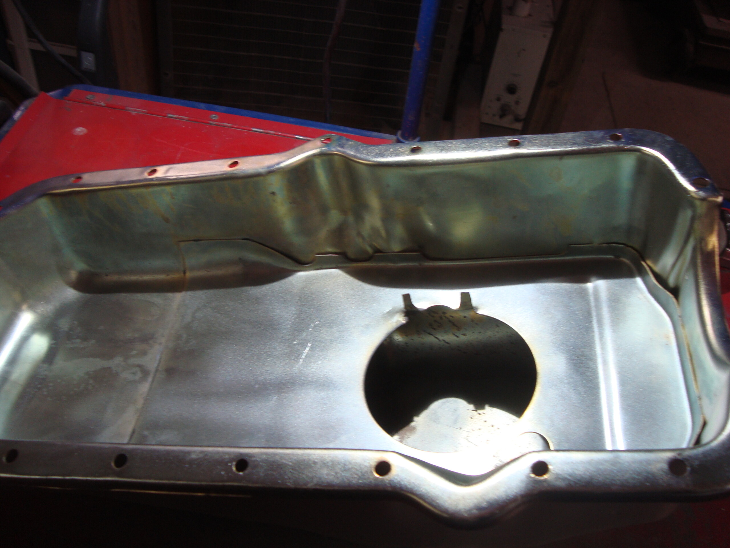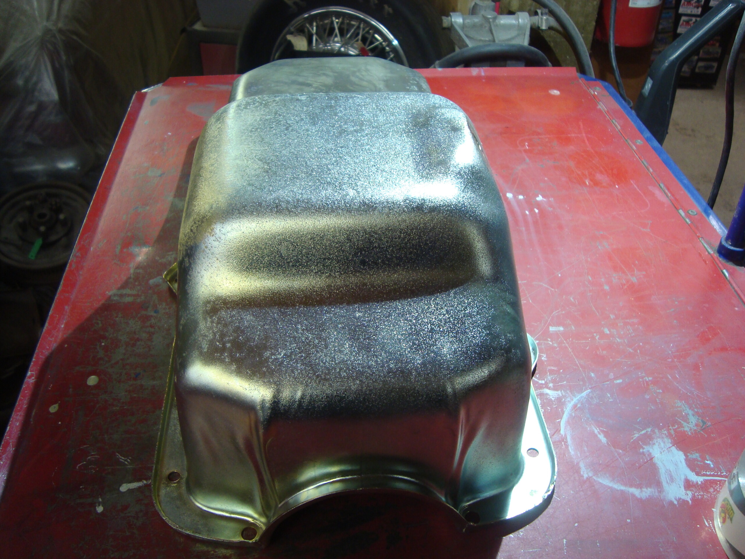 AMC car V-8 side drain oil pan. AMX Javelin & others. Blasted, E.Nickel, Yellow Zinced for preserving well in storage. This pan is NOT to be used on Jeeps that need the clearance for the suspension travel of the front dif. That is why it is advertised for cars. Some Jeeps can use this, but not all. Make sure of your application! All sales are final!