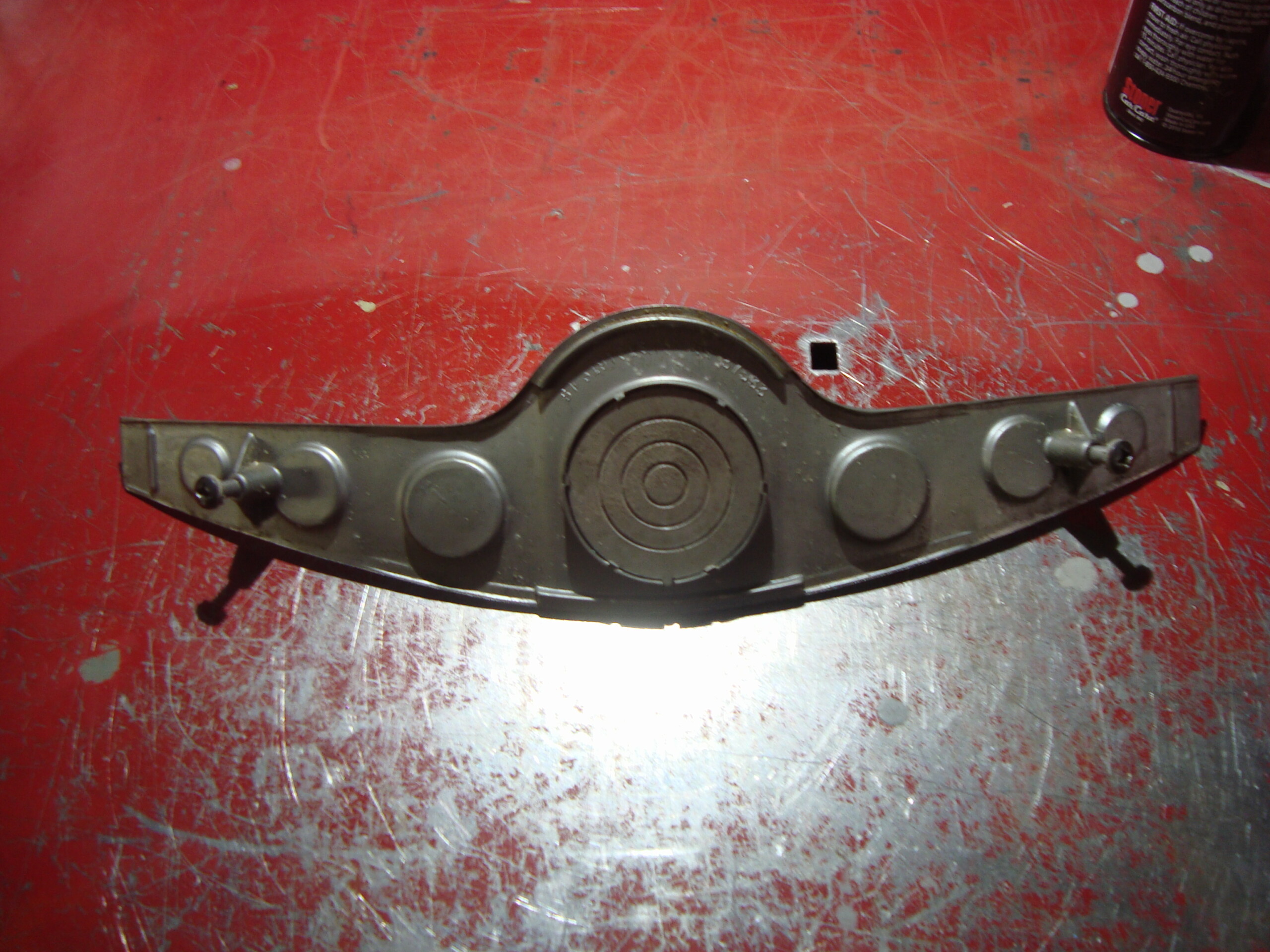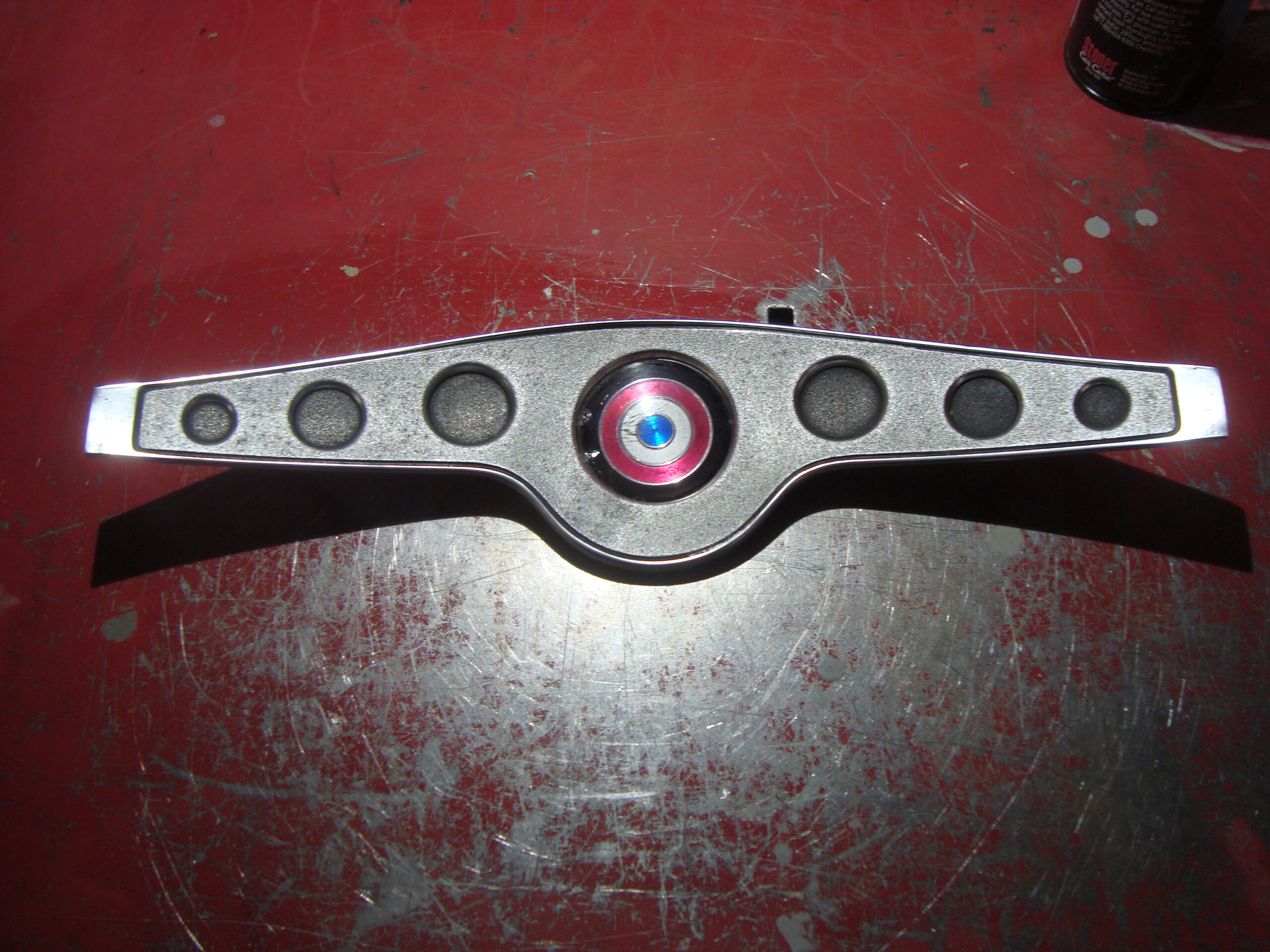 AMC Javelin 1970 steering wheel center. Plastic that covers the target emblem has small stress cracks in it.