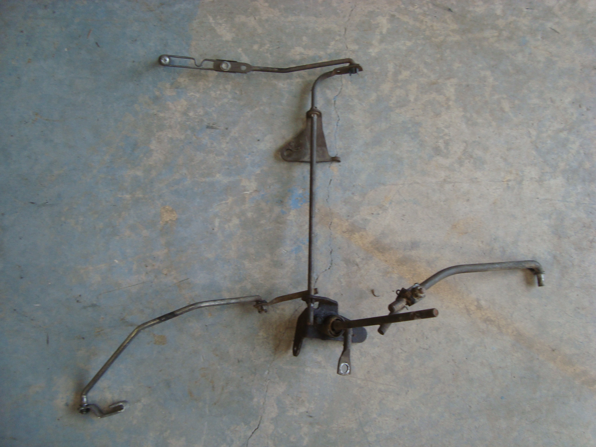 AMC Jeep torque-flite kick down linkage & column shift linkage. It is missing the return spring and the rod that goes from the bell crank to the trans gear selector. Nothing to do with the kick down part.. Joint bushings may be worn out or missing. THIS IS LATE MODEL! THE PART THAT BOLTS TO THE HEAD, FITS (I believe), 1980 and later V-8. If you want to make it fit your Javelin or AMX you will need to add some material to the plate that bolts to the back of the head, and re-drill and customize for the re-location of your bolt holes in your head. (I believe 1971 to 1979). And don’t use the column shift parts. You will still need a separate rod to go from the trans to your console shifter.