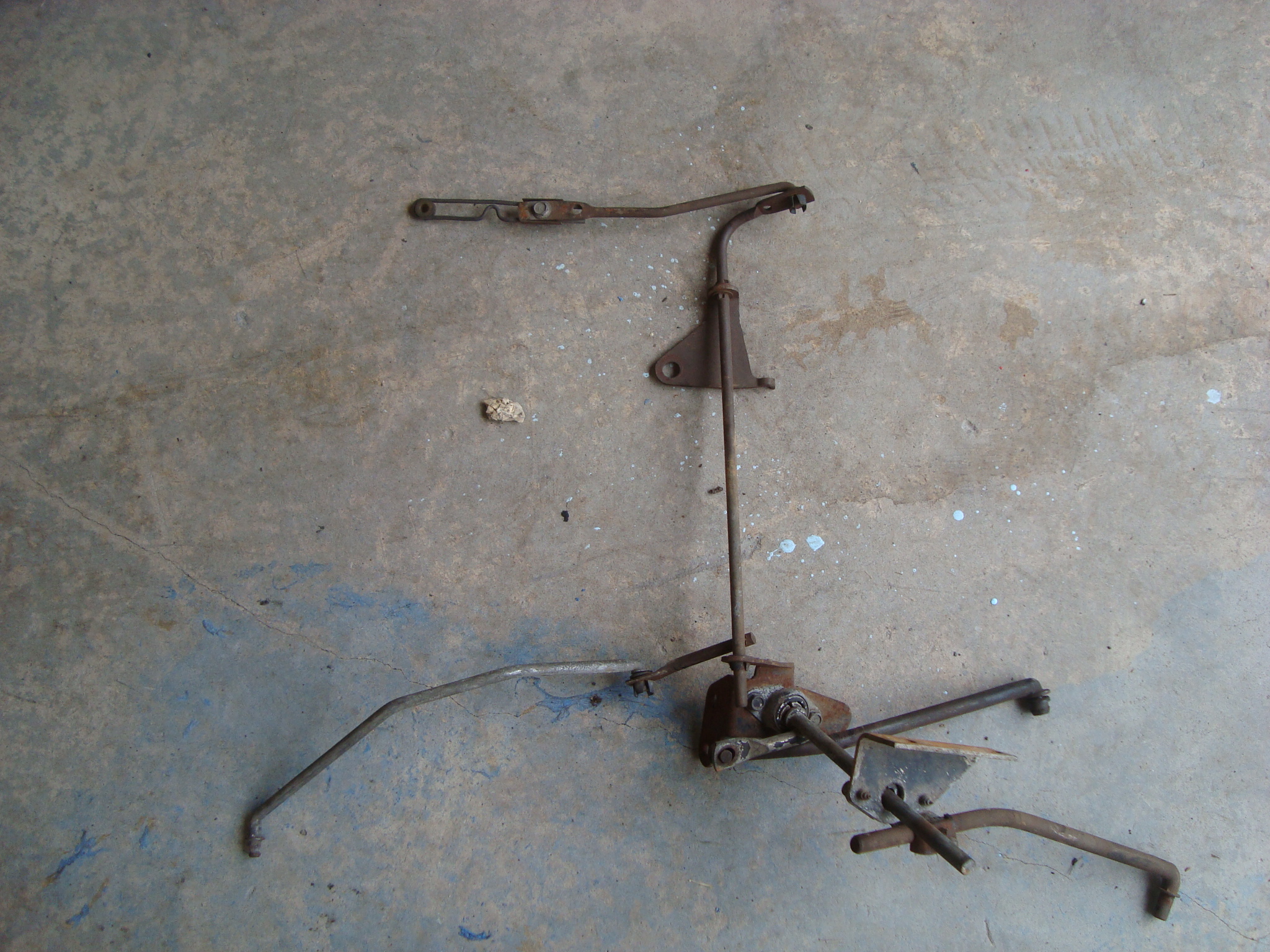 AMC Jeep torque-flite kick down linkage & column shift linkage. It is missing the return spring. Joint bushings may be worn out or missing. THIS IS LATE MODEL! THE PART THAT BOLTS TO THE HEAD, FITS (I believe), 1980 and later V-8. If you want to make it fit your Javelin or AMX you will need to add some material to the plate that bolts to the back of the head, and re-drill and customize for the re-location of your bolt holes in your head. (I believe 1971 to 1979). And don’t use the column shift parts. You will still need a separate rod to go from the trans to your console shifter.