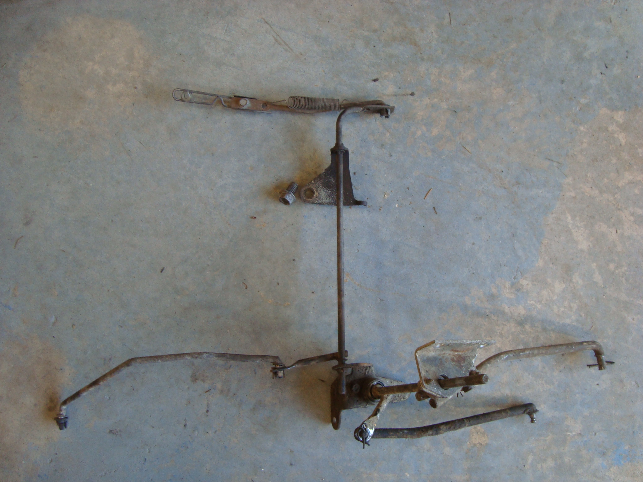 AMC Jeep torque-flite kick down linkage & column shift linkage. Joint bushings may be worn out or missing. THIS IS LATE MODEL! THE PART THAT BOLTS TO THE HEAD, FITS (I believe), 1980 and later V-8. If you want to make it fit your Javelin or AMX you will need to add some material to the plate that bolts to the back of the head, and re-drill and customize for the re-location of your bolt holes in your head. (I believe 1971 to 1979). And don’t use the column shift parts. You will still need a separate rod to go from the trans to your console shifter.