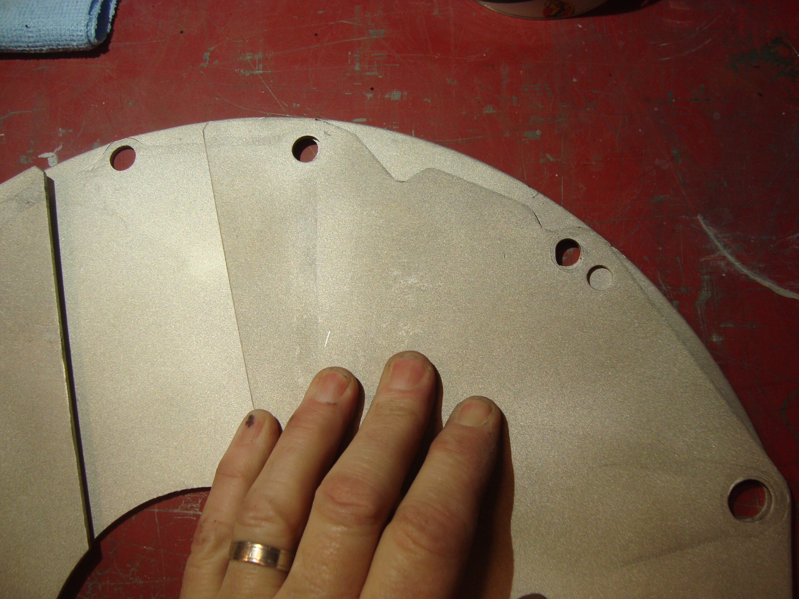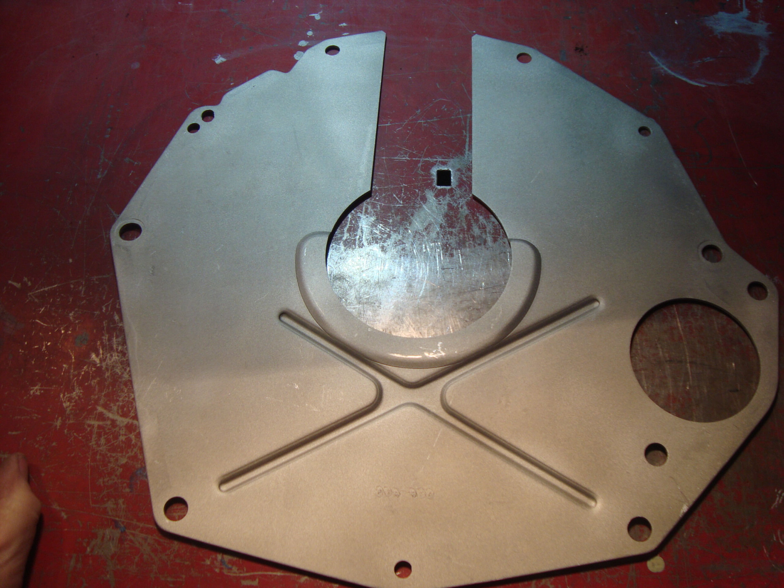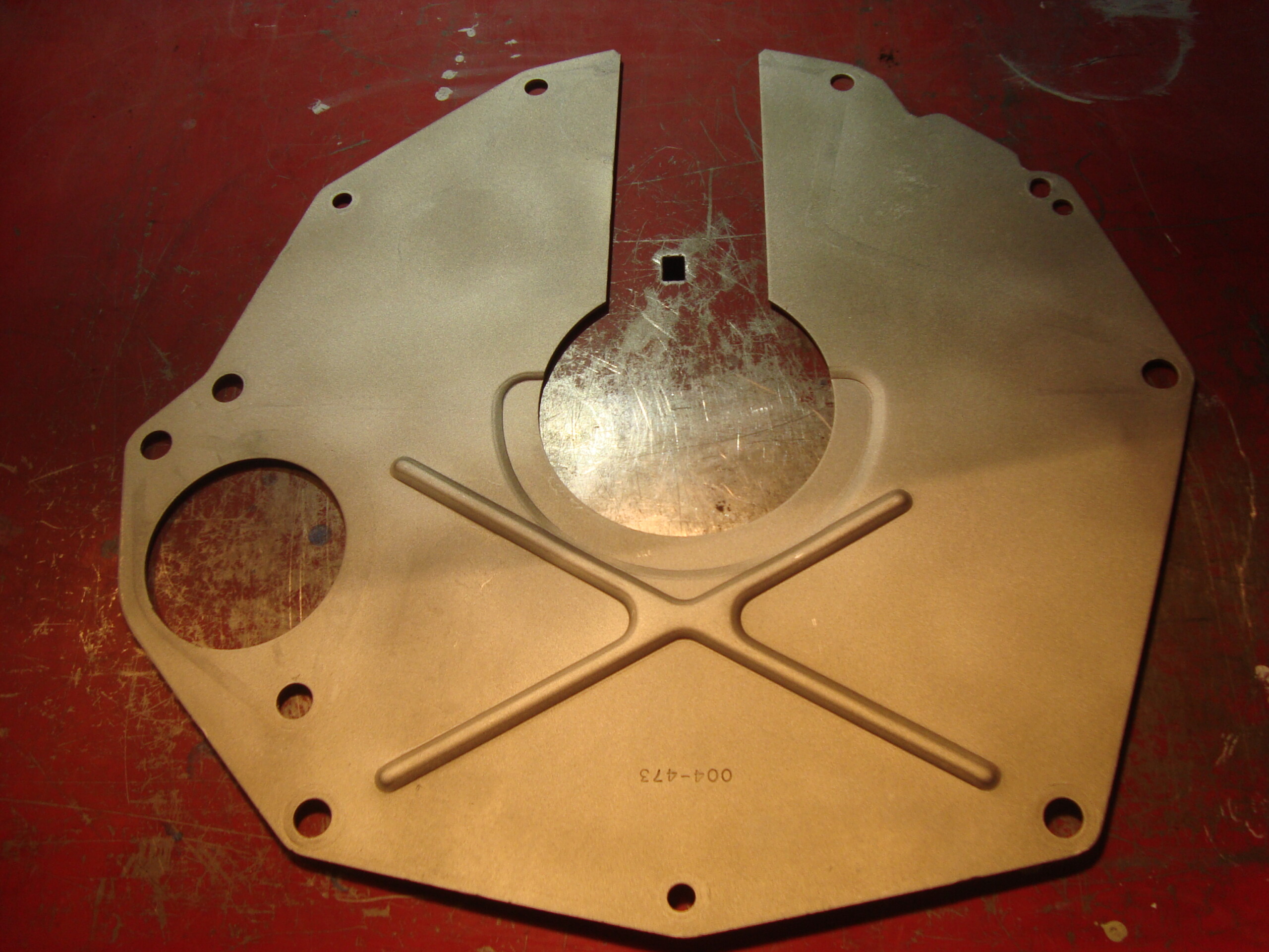 AMC Manual transmission aluminum motor plate. I think this is out of an inline 6 application, but with a little trimming and drilling would fit a V-8 application. See the comparison’s in the last 5 pictures. I think this is for a Jeep Wrangler AX15 or NV3550 transmission.