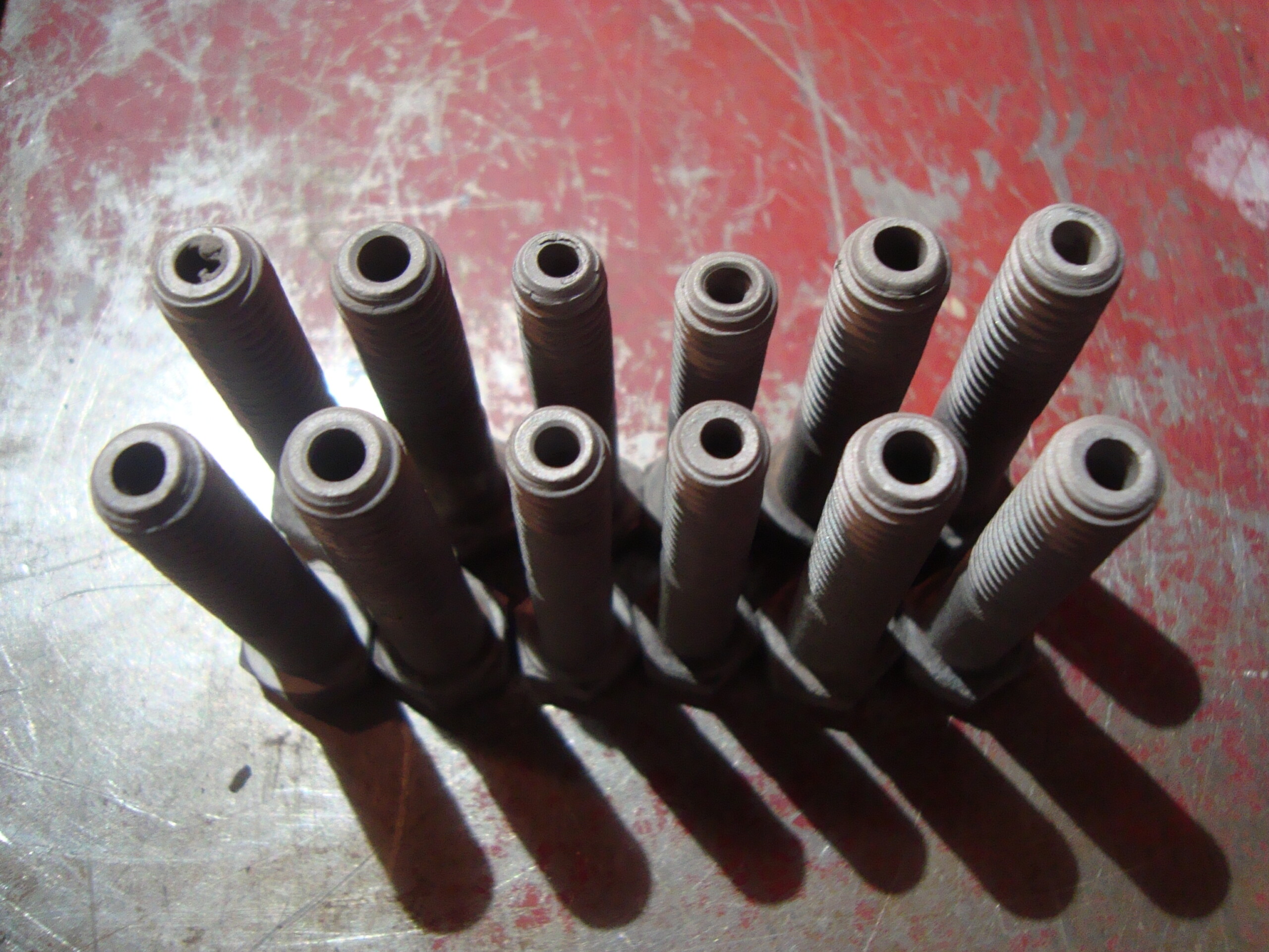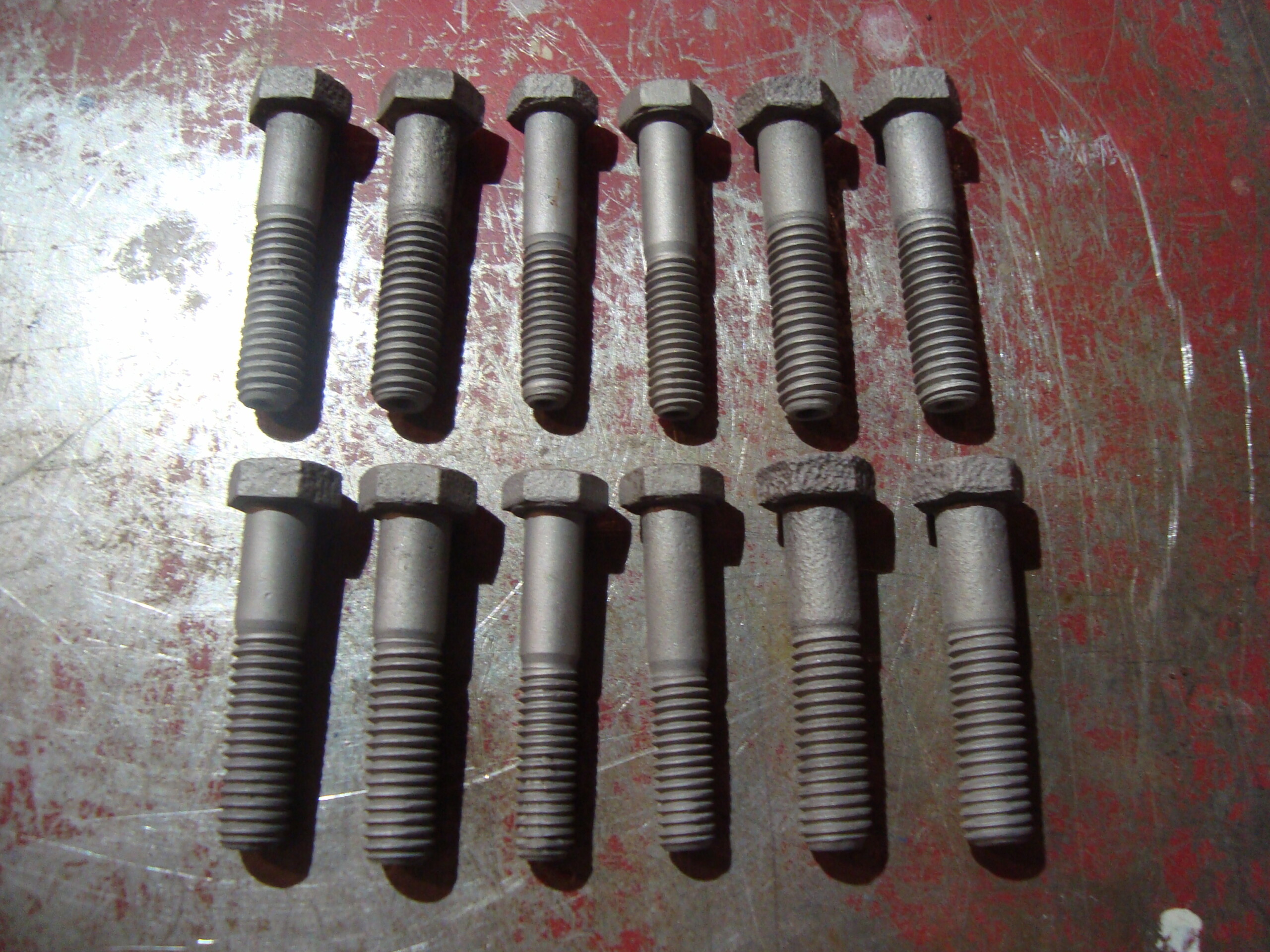 AMC V-8 third generation exhaust manifold bolts, one set of 12. 8,3/8 & 4,5/16. There is some pitting, but no rounded edges, and they are all hollow threaded as they should be. There is no wax in the hollow threads because they are used.